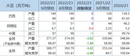 美国2022/23年度大豆年末库存预估下调为2亿蒲式耳,2022/23年度8月预估为2.45亿蒲式耳。2021/22年度大豆年末库存预估为2.4亿蒲式耳。美国2020/21年度大豆年末库存为2.57亿蒲式耳。