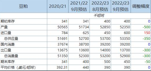 美国2022/23年度豆粕产量预估下调为5235万短吨,2022/23年度8月预估为5285万短吨。2021/22年度豆粕产量预估为5173.4万短吨。2020/21年度豆粕产量预估为5056.5万短吨。