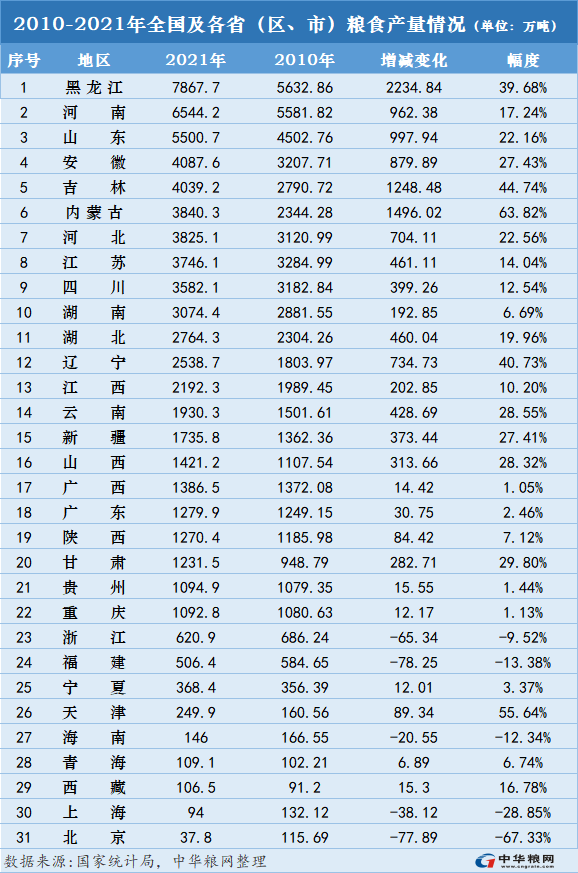 据中国网,国家发展改革委近日召开新闻发布会指出,黑龙江、河南、山东、安徽、吉林5个产粮大省2021年产量达到5607.8亿斤,超过全国40%,有效维护了国家粮食安全。 其中,黑龙江是我国粮食产量***大的省份。数据显示,2021年黑龙江粮食产量为7867.7万吨,占国总量的11.5%。而黑龙江2020年的总人口只有3185.01万人,人均粮食产量超过2.4吨,而我国人均粮食占有量为474公斤,这意味着,黑龙江生产的绝大部分粮食,是以商品粮的形式供给其他省份。 河南作为农业大省,名副其实的“中原粮仓”,用占全国6.2%的耕地,生产了中国10%的粮食,粮食总产量连续四年突破6500万吨。小麦种植面积全国第一,产量占全国1/4。不仅养活第一农业人口大省,更是每年外调出原粮及制成品600多亿斤。 山东2021年粮食产量首破1100亿斤大关,是全国5个增产10亿斤以上的省份之一,居全国第三位。不仅是粮食生产、储备、流通和加工转化大省,每年可向社会提供商品粮800亿斤以上。且山东粮食品质优、产品好、品牌响,粮食产业经济工作总产值居全国第一。 来源:饲料研究 03、关乎粮食安全 近年来,我国粮食连年丰收,粮食总产量稳步提升,但是,粮食总产量稳步提升的同时,各地区粮食产能仍存在较大差异。尤其在主销区,粮食自给率低的问题仍较突出。
